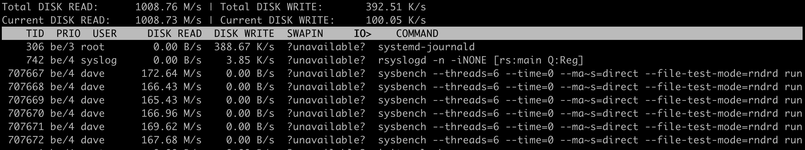 我们通过 sysbench 工具进行对应压测验证,同时观察对应的 I/O Wait 的表现。注意为了更好体现效果,我们测试 I/O 的过程中,将 threads 设置为 CPU 的全部核数的 50%(本文为 --threads=6)