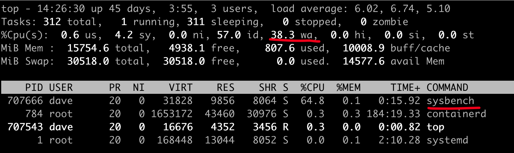 在运行 I/O 压测过程中,我们使用 top 命令查看 CPU 占用情况,可以看到 wa (I/O wait)值展示,图中为 38.3 %: